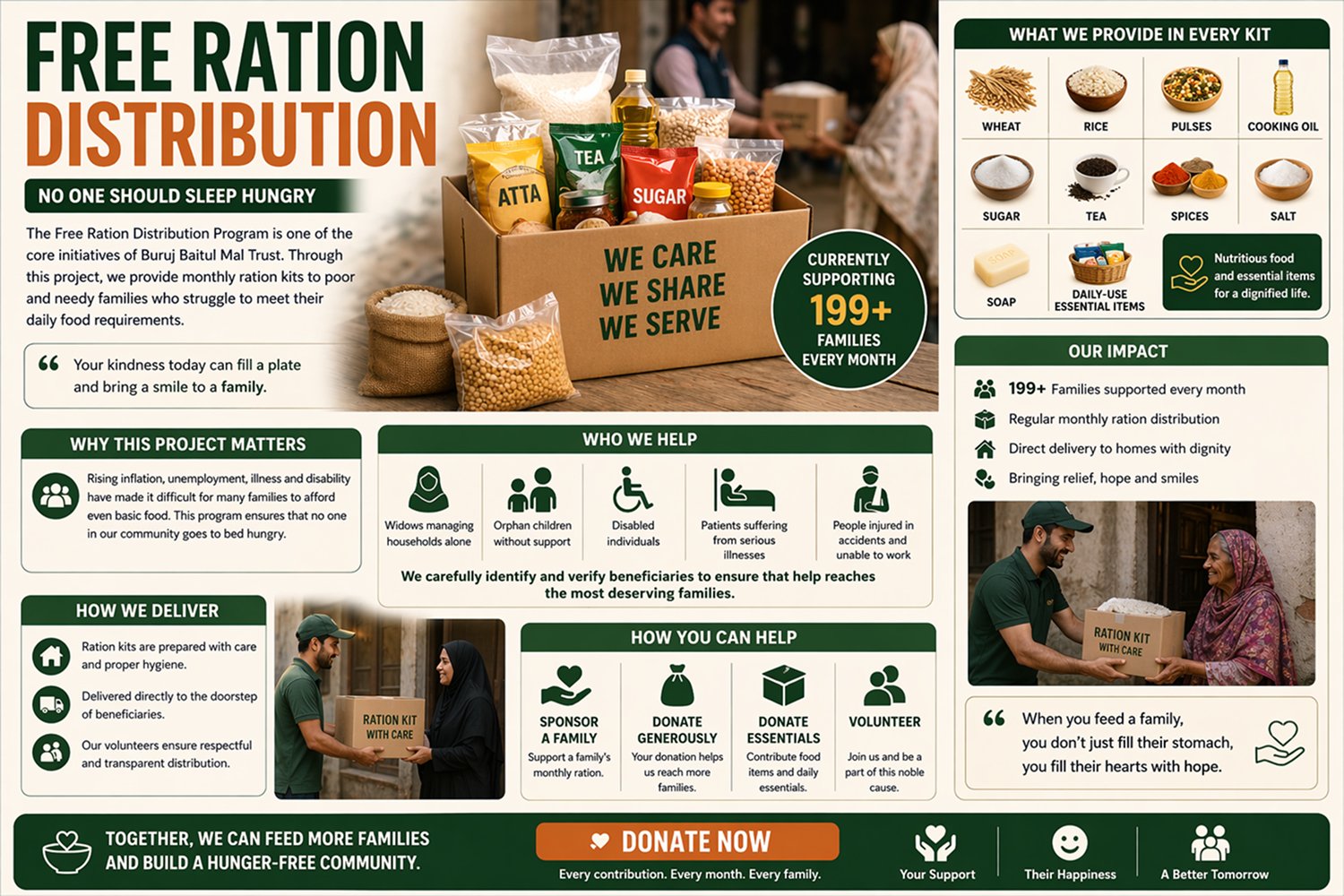 Providing monthly ration kits to more than 199 poor families, including widows, orphans, and disabled individuals.